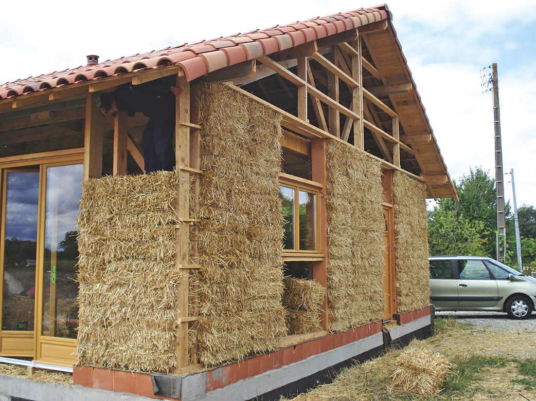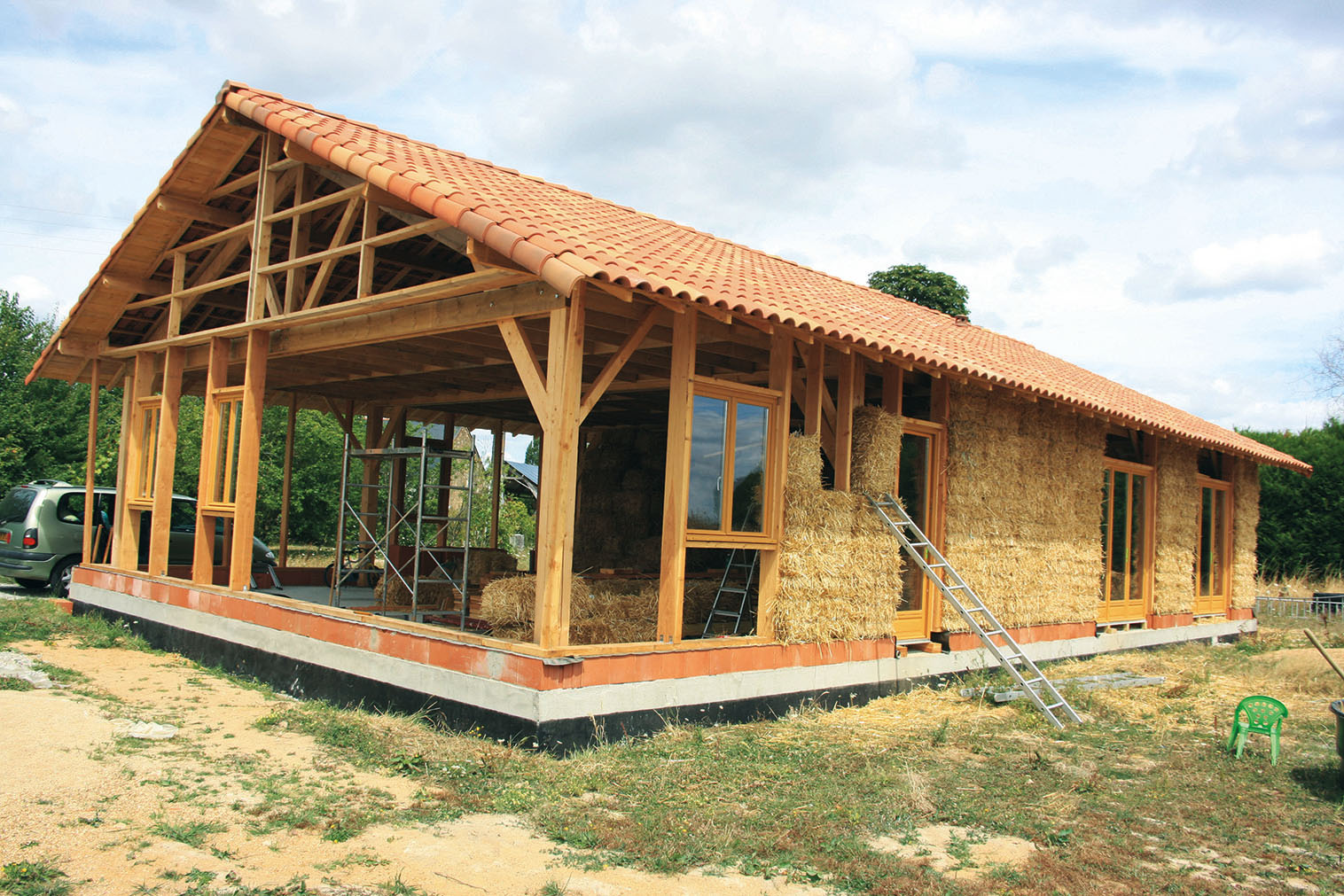 Le couple consulte des livres sur les différentes techniques de construction en paille et « la cellule sous tension semblait la plus simple ». Les autoconstructeurs s'en inspirent et la couplent à une structure bois en poteau-poutre (voir Les Travaux en images). Ils aideront même l'agriculteur à récolter les bottes de paille dans le champs juste derrière leur maison. « Elle n'est pas bio, mais elle n'a parcouru que quelques mètres pour arriver chez nous, ce qui nous semblait plus cohérent. »