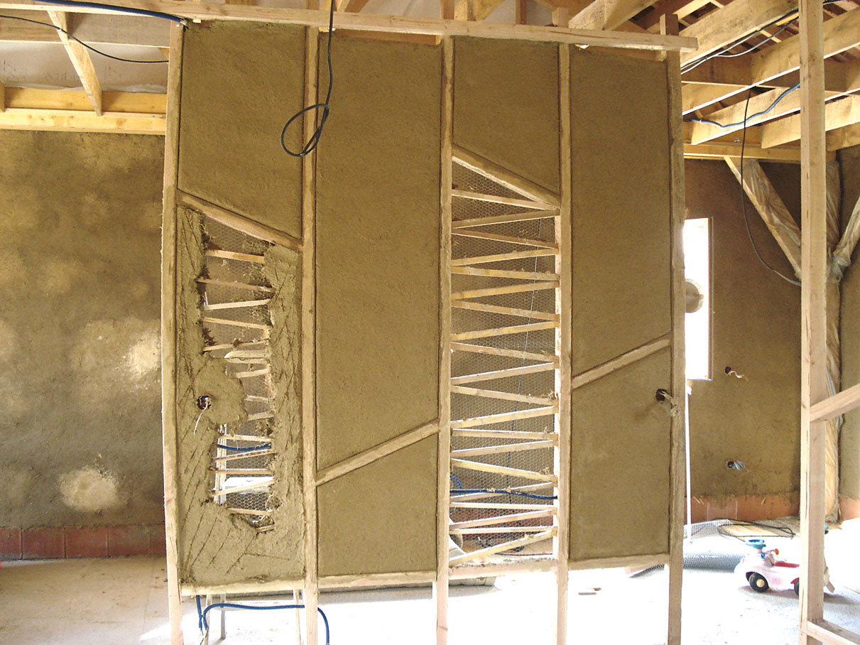 Les montants étant moins épais que les bottes de paille, l'espace entre les bottes est comblé d'un mélange terre-paille qui coupe le pont thermique de l'ossature et aligne la paroi.