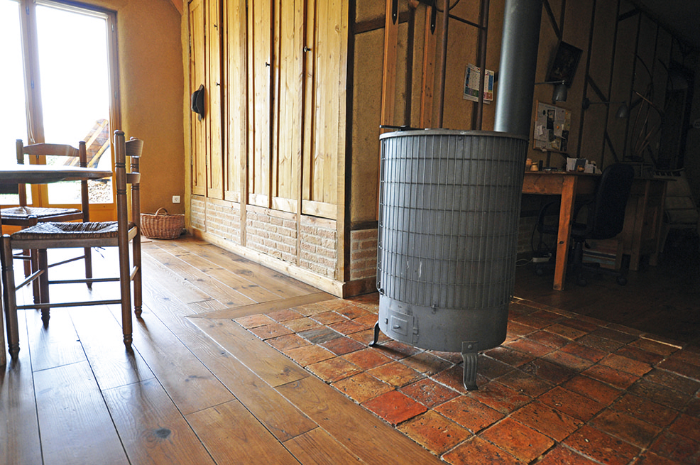 Sol Fondations béton (tranchée 40 x 40 cm), polystyrène 4 cm, dalle béton, tomettes (réemploi) sur lit de chaux ou parquet pin maritime noueux (foncé au brou de noix + huile de lin) sur lambourdes
