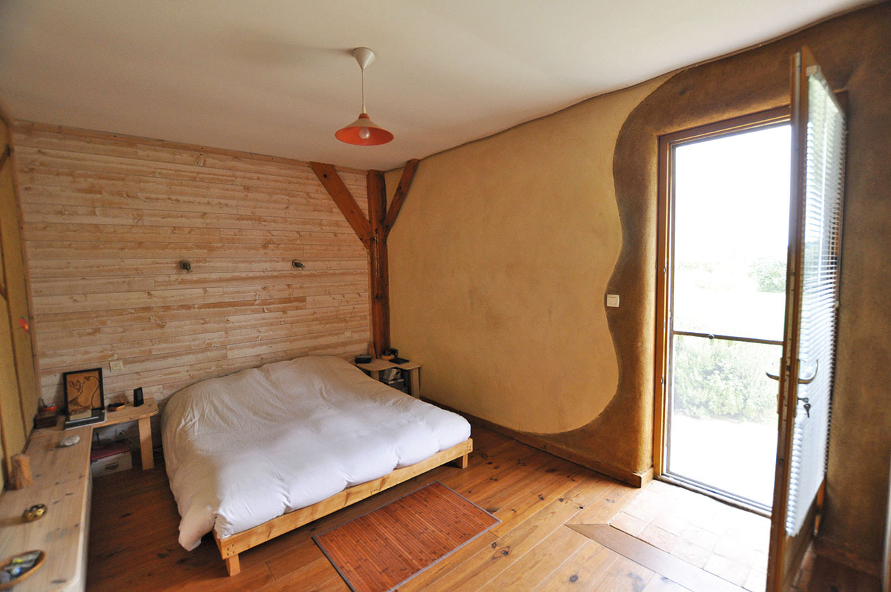 Murs Enduit chaux-sable, gobetis chaux, bottes de paille (50 cm) sous tension entre ossature secondaire douglas 50 x 200 mm (75 x 200 mm fenêtres) sur une rangée de brique monomur terre cuite et feuille goudronnée (anti-remontées capillaires), gobetis argile, corps d'enduit argile + paille d'orge macérée, finition terre + sable + bouse de vache + paille hachée à la tondeuse + fromage blanc, poteaux épicéa sur plots béton liés aux fondations