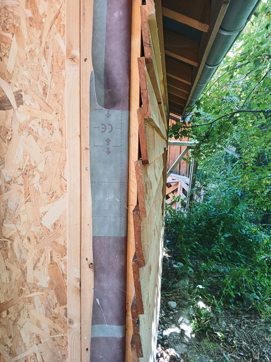 Pour qu'un bâtiment soit pérenne, « il doit être protégé de la pluie, introduit Samuel Courgey, formateur de l’association Arcanne. Les risques sont faibles si la toiture, les éléments de couverture, les parements, enduits, bardages, baies vitrées, joints sont imperméables ». Solins métalliques le long des tableaux de fenêtre et en soubassement, descente de toiture qui dépasse le pied de mur sont des protections valables en neuf comme en rénovation.