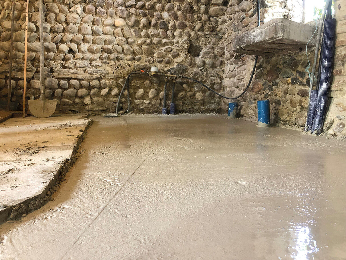 Artisan maçon du bâti ancien chez Racine Trad’ (69), Grégory Jarin a l’habitude d’intervenir dans des maisons en pisé où se posent des problèmes dus aux remontées capillaires dans les murs. « Les dalles en ciment faites il y a 30 ans révèlent leur inadéquation : en bloquant le transfert de l’humidité, elles orientent l’eau vers les murs. » Il faut alors supprimer ces dalles. « Or, casser un matériau aussi dur requiert une force mécanique à sa mesure (piqueur pneumatique de 20-30 kg, voire mini-pelle...), susceptible d’affecter le bâti. Le corps du maçon ou de la maçonne est aussi impacté. Ça déglingue. Une dalle à la chaux est bien moins traumatisant », témoigne-t-il.