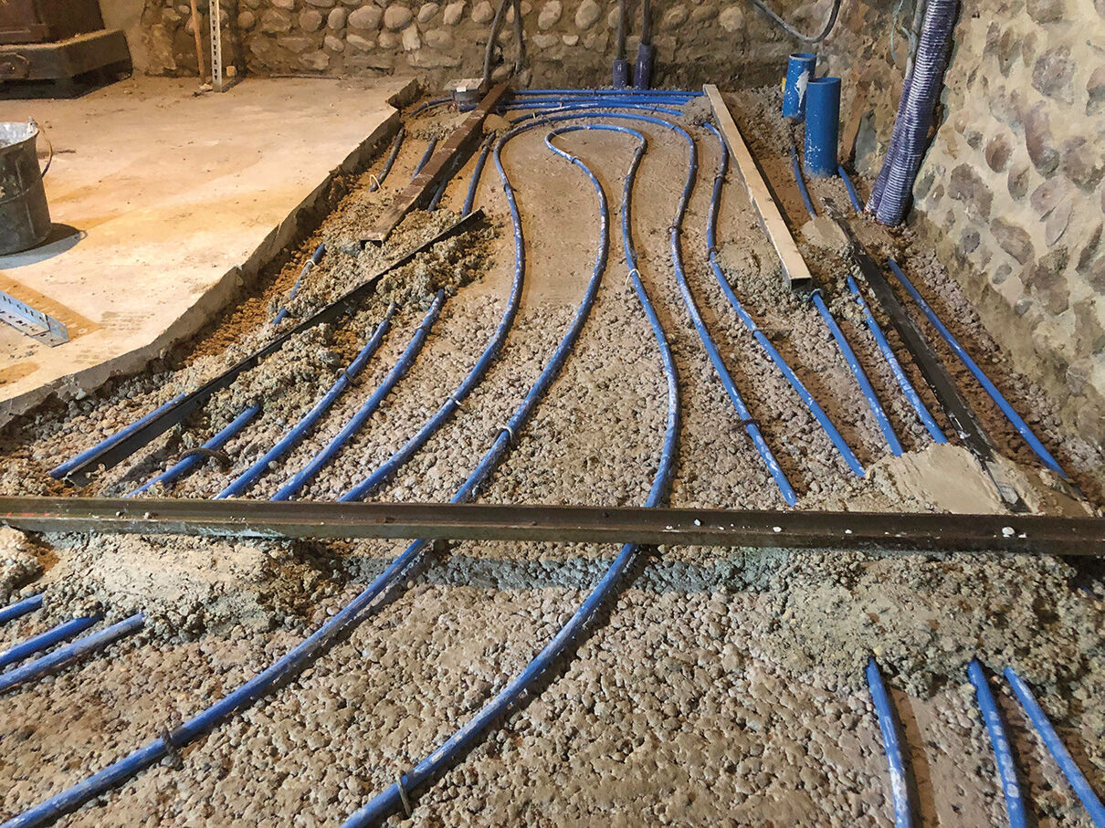 « Quelques jours avant le début de ce chantier de dalle en béton de chaux de 12 cm sur hérisson ventilé pour une salle de bains de 10 m2, le client m’a signalé prévoir finalement un chauffage au sol. En principe, cela aurait impliqué un décaissement supplémentaire pour donner la place à un isolant (pour éviter les déperditions thermiques par le bas), donc un redimensionnement du chantier. Mais ni le contexte, ni le budget ne le permettaient (autoréhabilitation accompagnée sur deux jours consécutifs et aux dates prévues par le client). J'ai donc proposé un compromis avec l'épaisseur dont nous disposions (12 cm) : un double coulage « semi a fresco » de la dalle [sans séchage intermédiaire, ndlr], l'idée étant de permettre aux deux couches de fusionner pour n’en faire qu'une seule au final. Une première dalle de 6 cm en chaux NHL5 et pouzzolane 0/14 aux caractéristiques de correcteur thermique, en mélange relativement sec pour qu'il soit praticable rapidement afin d'y poser le serpentin de chauffage. Puis, le lendemain, coulage et dressage de la seconde dalle en béton de chaux (NHL5 et pouzzolane 0/12) », témoigne Grégory Jarin, artisan maçon du bâti ancien.