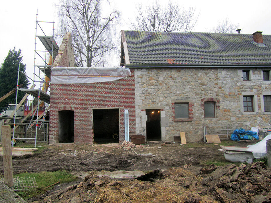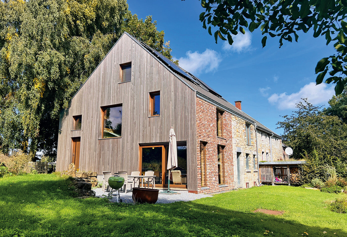 Il y a 40 ans, mes parents ont acheté cette ferme tout en longueur construite avec des pierres du pays, raconte Jonathan. Elle comprenait un corps de logis et une étable pour les vaches, les poules et les chèvres. En 2015, ils nous ont donné les deux bâtiments de l’étable avec du terrain autour. Celle-ci est collée à la maison, comme traditionnellement dans cette région de la Wallonie. » Si Jonathan est né en Belgique, Martha est Équatorienne. Ensemble, ils ont deux enfants. Le terrain étant en zone agricole, la construction neuve y est interdite et la rénovation s’impose. Peu formés, ils s’appuient sur les connaissances du père de Jonathan, ancien ébéniste dont l’entreprise vient de faire faillite et qui peut s’investir à temps plein sur le chantier. « Mes parents nous ont aidés sur la démolition de la toiture, de la charpente et dans la réalisation des finitions de la maison », relate Jonathan.