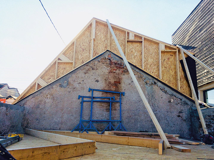 Pour respecter cette histoire, la jeune architecte affine les plans pour obtenir « une insertion la plus harmonieuse possible ». Elle crée une maquette 3D numérique, mais aussi une en carton pour mieux se rendre compte de « comment le projet s'insérait dans l'environnement et trouver la forme du nouveau toit qu'on avait du mal à visualiser ». Charpente et couverture sont vétustes ; « quitte à les retirer, on en a profité pour gagner des mètres carrés en surélevant le toit ». La partie la plus ancienne dispose d'un grenier qui sera aménagé en R+1 et la surélévation permet de prolonger au-dessus de l'ancienne extension (actuelle cuisine) ce plancher existant, mais en conservant la différence de niveau. Sans quoi « on aurait dû remonter l'ancien plancher au niveau de l'autre, donc augmenter la hauteur de la façade sur rue. Or, nous ne voulions pas dénaturer la maison, ni la rue qui est mignonne ». Alice refuse aussi de modifier la hauteur de l'autre façade « pour ne pas ajouter d'ombre portée sur le jardin qui est petit ». Face à ces deux contraintes, « un toit unique paraissait très massif et effaçait l'histoire de cette extension ajoutée à la première partie ». Le toit sera finalement double, en forme de M asymétrique dont les fortes pentes maximisent les apports solaires en hiver par les fenêtres de toit.