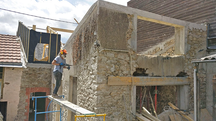 Autre contrainte du bâti ancien à dompter : « La priorité, c'est l'humidité », tranche Alice. Gérer l'étanchéité de l'enveloppe de la maison face à la pluie, les remontées de l'eau du sol par capillarité, la vapeur d'eau dans l'air intérieur... Une fois retiré l'enduit ciment qui recouvre les deux faces des murs, y emprisonnant ainsi l'eau remontant du terrain, les autorénovateurs appliquent un enduit chaux à pierre-vue côté extérieur, qui laisse l'humidité s'évacuer naturellement. « On voyait un trait à 1 m du sol pendant au moins un an ensuite, montrant que le bas de mur était toujours humide. » Même si l'enchaînement des travaux complique la donne, il faudrait toujours isoler sur mur sain et sec.