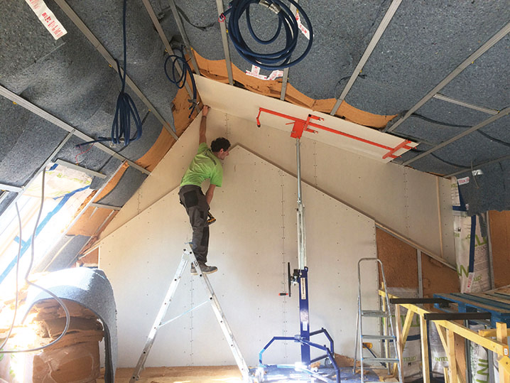 Toit : alliage PLX, pare-pluie, volige, chevrons ventilés, 20 cm panneau laine de bois entre pannes, 10 cm laine de bois dans ossature bois rapportée, pare-vapeur, 2 cm isolant coton recyclé Métisse dans vide technique, fourrure, plaque de plâtre, peinture