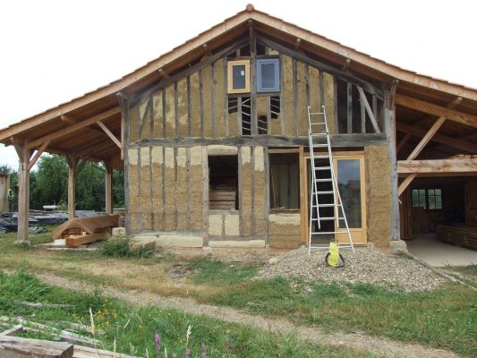 Le chantier démarre en 2004. « Pour que ce soit bien fait, il faut prendre le temps, c'est tout le problème de la construction aujourd'hui, estime Loïc. Sur cinq ans, on a travaillé à 50 % sur la maison et 50 % en dehors. » Seuls les travaux de terrassement et le solaire thermique sont confiés à des professionnels. Le couple démonte une grande partie du bâtiment pour l'éco-restaurer ensuite. Ne reste plus qu'un squelette de bois.