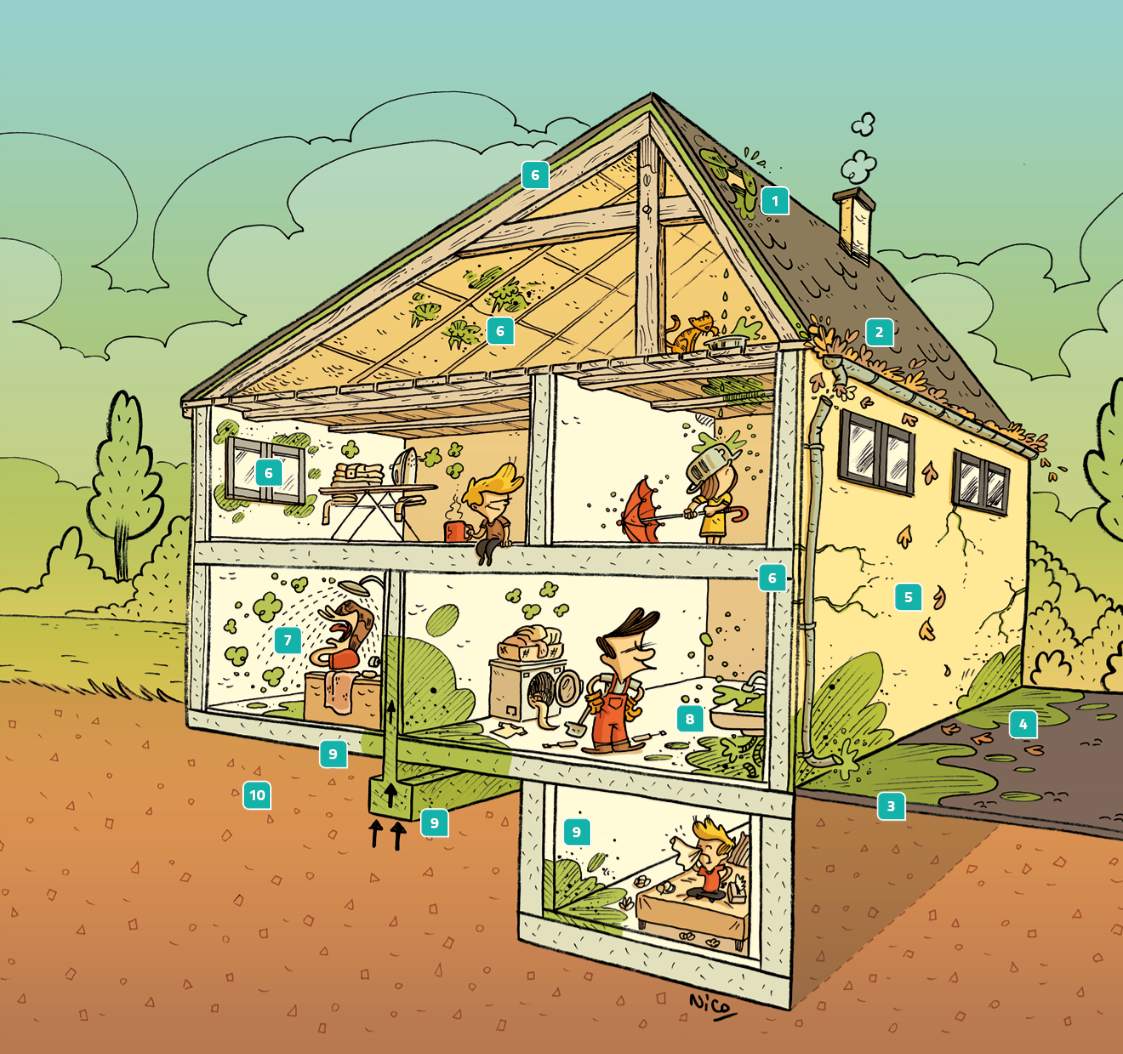 Causes : vieillissement ou cassure tuiles, ardoises, etc., fissure de cheminée (chapeau, souche, raccord au toit), mauvaise étanchéité des fenêtres de toit.