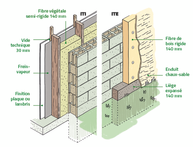 En cas d’isolation par l’intérieur (ITI), la vapeur peut migrer au travers des parpaings qui n'y sont pas totalement fermés. Si la finition en enduit extérieur est ouverte à la vapeur, appliquer côté intérieur une membrane hygrovariable [son Sd varie selon l’humidité ambiante et la vapeur peut transiter dans les deux sens, ndlr]. Pour rappel, la paroi doit être cinq fois plus "ouverte" dehors que dedans. Si le mur est enduit au ciment à l’extérieur, il faut un frein-vapeur au Sd élevé (18 m) pour réduire l’introduction de vapeur dans la paroi, car l’enduit freinerait sa progression. Sauf si le mur est constitué de béton armé – peu ouvert à la migration de la vapeur –, je déconseille les pare-vapeur (Sd ≥ 20 m), qui emprisonnent l’eau dans la paroi en cas de défaut d’étanchéité.