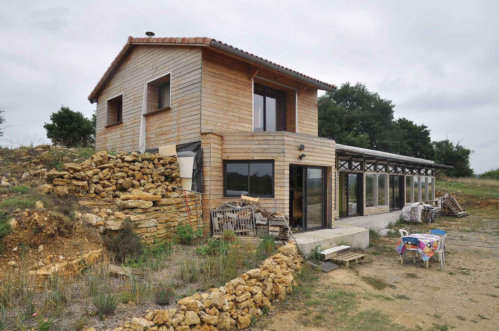 • Mode constructif : soutènement pneus + terre, ossature bois, toiture végétalisée (60 cm), triple-vitrage